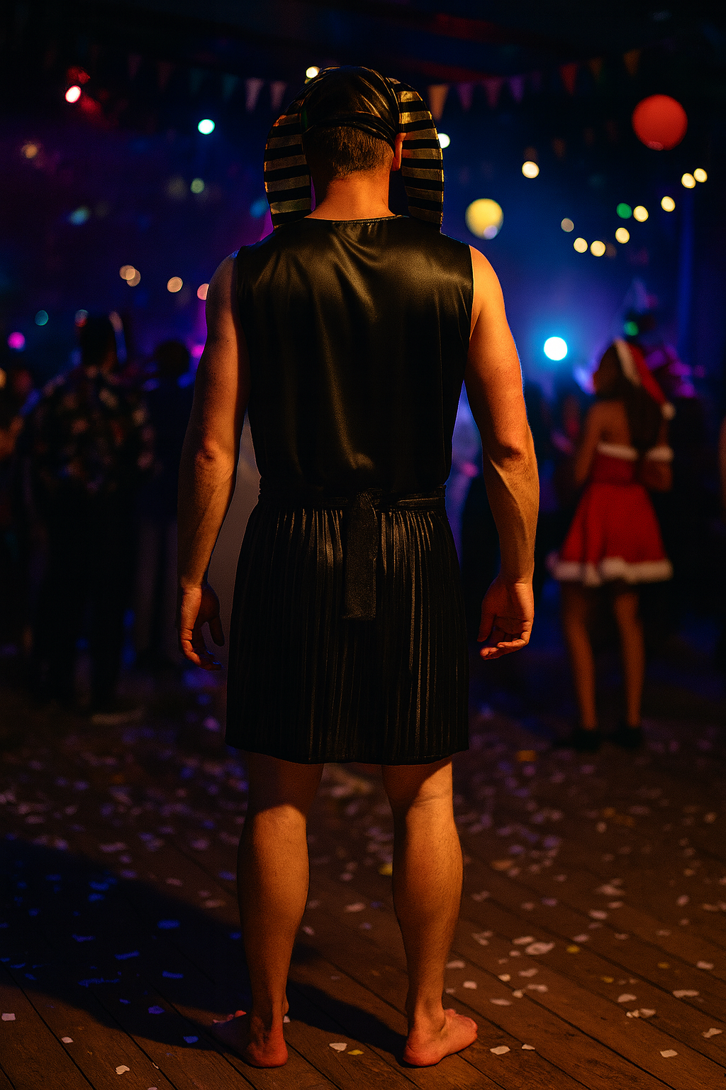 Het kostuum is gemaakt van comfortabel polyester en bestaat uit een tweedelige set met een glimmende top, een bijpassende rok en de kenmerkende farao-hoofdtooi. Dankzij het lichte materiaal kun je de hele avond dansen zonder dat het te warm wordt.